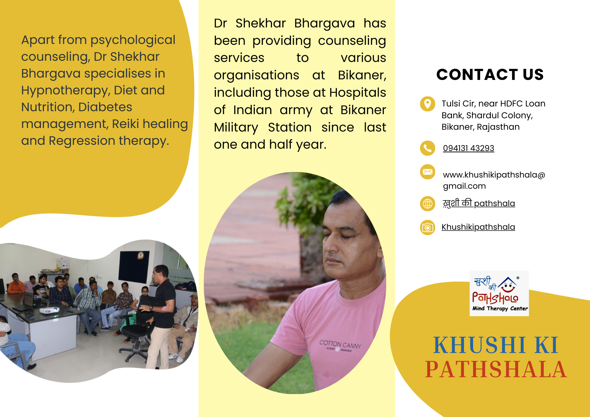 Khushi Ki Pathshala, is a counseling center, provides marriage counseling, family counseling, divorce counseling, child & teenage counseling, depression counseling, anger management, de-addiction,  spiritual counseling, motivational speaking, healing with Reiki and meditation. Counseling is an art but this art gets its most beautiful expression with the “willingness for counseling”. The only pre-requisite to reach a comprehensive and desired conclusion to any problem would be an individual’s openness. The more we know you, the more we come closer to a perfect solution for you. Our Centre is not a place of giving readily prepared prescriptions or providing one-directional advice. Our aim is to facilitate others to find the key of self-reliance and recognize their strengths and resources to cope up with their problems.